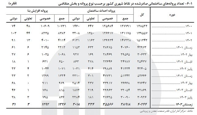 تعداد پروانههای ساختمانی صادرشده در نقاط شهری کشور در زمستان سال 1403 برحسب نوع پروانه و بخش متقاضی به صورت کلی ۴۰ هزار و ۲۴۴ فقره بوده که در مقایسه با پاییز ۹۳۱۸ فقره پروانه افزایش یافته است.