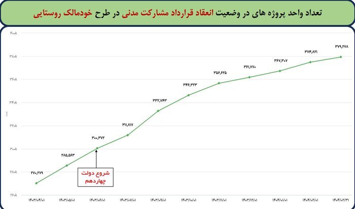 براین اساس تعداد واحد پروژه های در وضعیت انعقاد قرارداد مشارکت مدنی در طرح خودمالک روستایی در ابتدای شهریورماه ۱۴۰۳ (آغاز بهکار دولت چهاردهم) ۳۰۰ هزار و ۳۷۲ واحد بود.