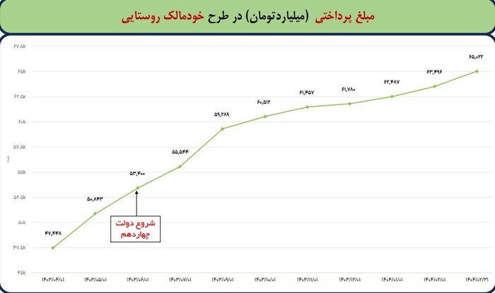 مبلغ پرداختی در طرح خودمالک روستایی در آغاز بهکار دولت ۵۳ هزار و ۴۰۰ میلیارد تومان (۵۳.۴ همت) بود که در پایان اردیبهشتماه با رشد ۲۱.۷ درصدی به ۶۵ هزار و ۲۲ میلیارد تومان (بیش از ۶۵ همت) رسیده است؛ بر این اساس از ابتدای فعالیت دولت چهاردهم ۱۱ هزار و ۶۲۲ میلیارد تومان تسهیلات به این منظور پرداخت شده است.